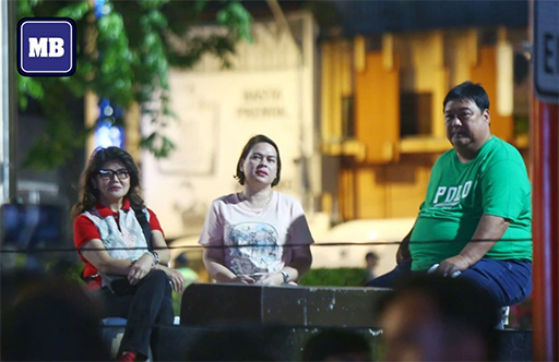 2024年1月28日,副總統薩拉·杜特地在達沃市集會場外與參議員伊梅·馬科斯和西達沃省省長克勞德·包蒂斯塔交談。 (基斯·巴孔科攝)