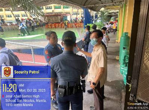 2025年10月20日,馬尼拉警區警員在何塞·阿巴德·桑托斯高中接到炸彈威脅報告後,與學校工作人員協調進行安全檢查。檢查中未發現爆炸物。 (馬尼拉警區圖)